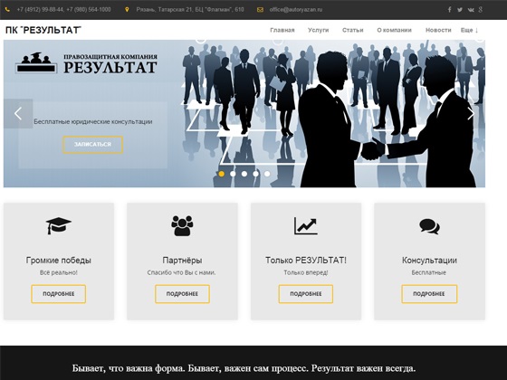 Правозащитная компания «Результат» работает в Рязани с 2010 года, имеет в своем активе более 500 выигранных дел. Наши требования удовлетворили такие организации, как Сбербанк России, сеть супермаркетов «ДНС», интернет-провайдер «Спарк», Государственная инспекция труда, строительная компания «Развитие-строй», целый ряд страховых компаний и многие др ...